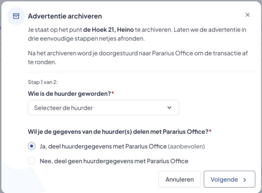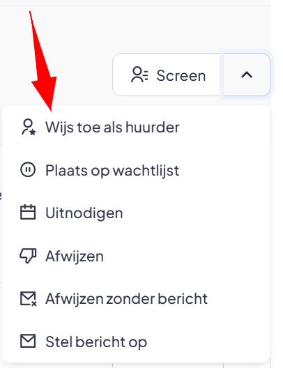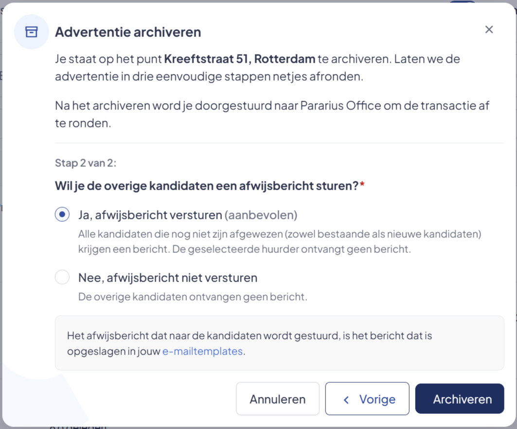 Je kunt ook door een advertentie te archiveren een huurder selecteren. Dit werkt sneller en je kunt direct alle overgebleven kandidaten een afwijsbericht sturen.